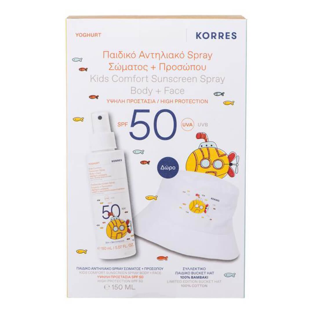 Το σετ περιλαμβάνει το Korres Kids Comfort Sunscreen Spray Body & Face, μαζί με ένα πρακτικό καπέλο. Πρόκειται για ένα απαλό αντηλιακό spray για σώμα και πρόσωπο SPF 50, σχεδιασμένο ειδικά για την ευαίσθητη παιδική επιδερμίδα, που απορροφάται άμεσα και προσφέρει υψηλή προστασία από τον ήλιο.